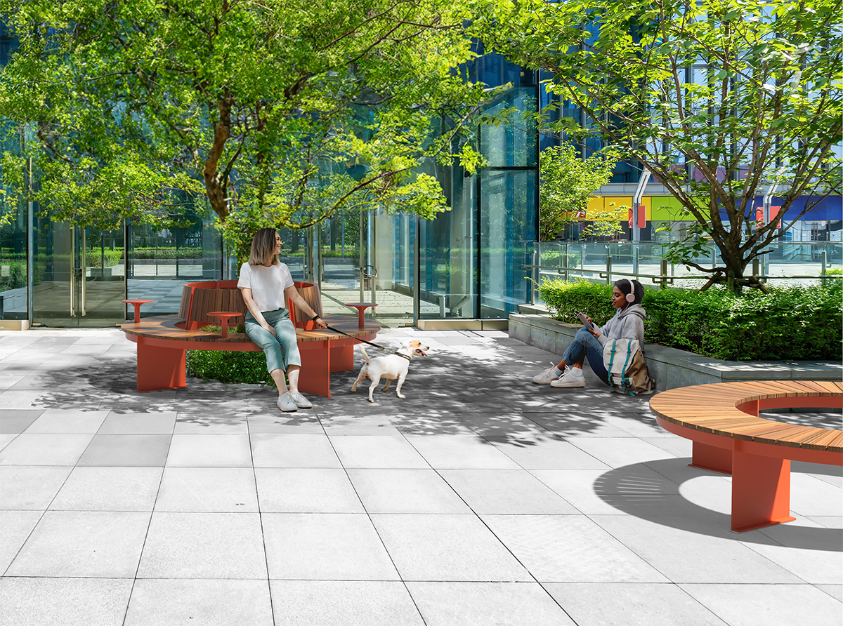 Our GIOCO urban benches are available with or without a sun shelter. Thanks to occasional tables and a sun shelter option, these functional benches bring life to public spaces such as pedestrian streets, school grounds, city parks and dog parks.
