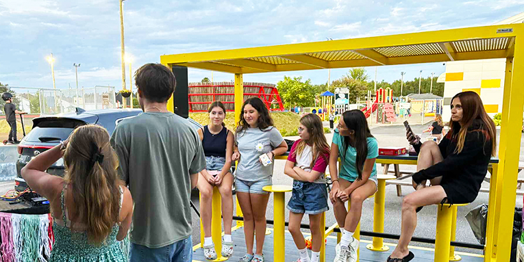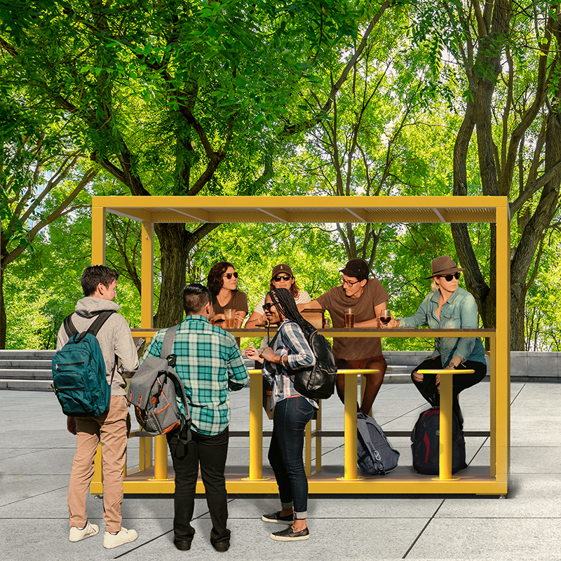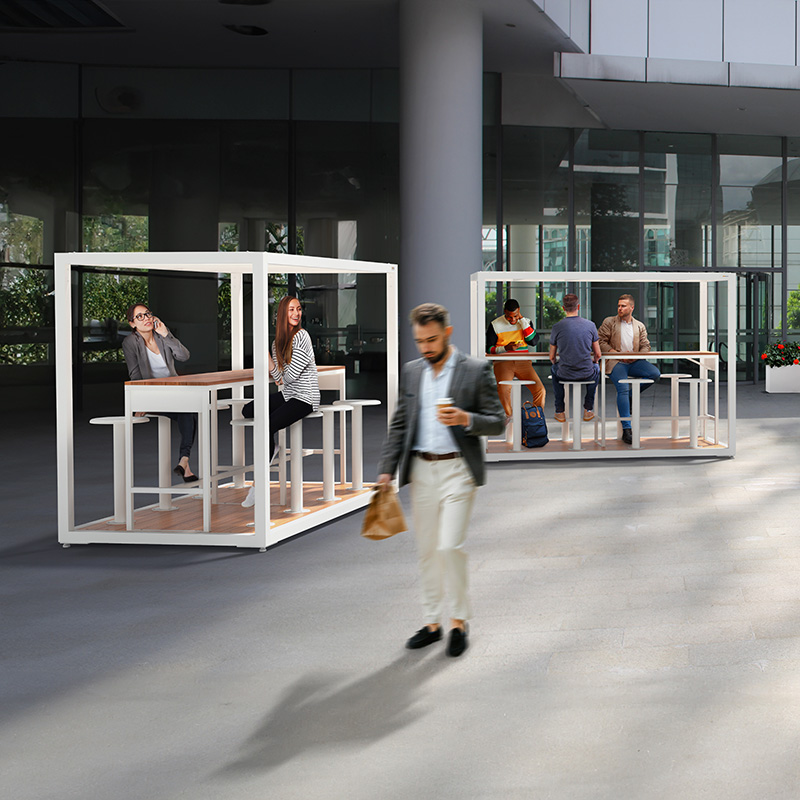 CABANA GET TOGETHER offers a multitude of configurations designed to create stimulating collaborative environments: on a rooftop terrace, a workplace courtyard, a school campus, a pedestrian street, parking spaces along sidewalks, or even in urban parks.