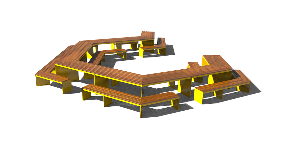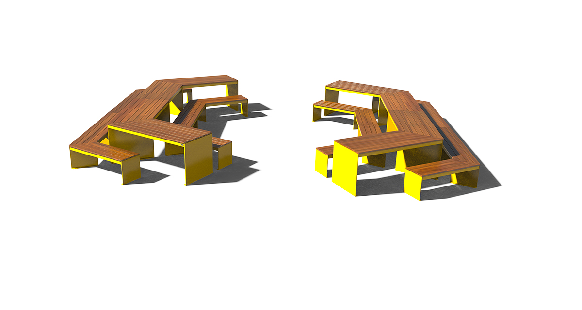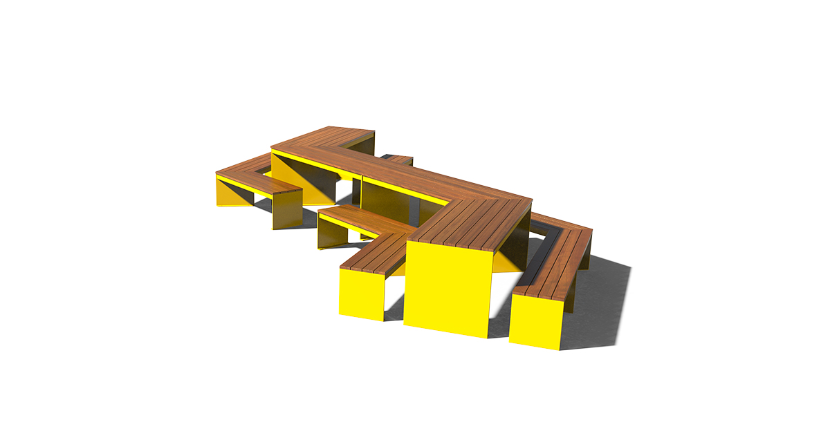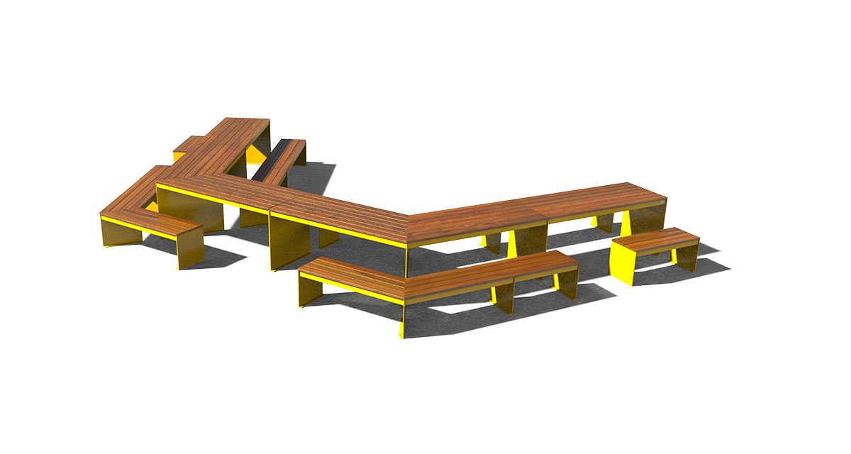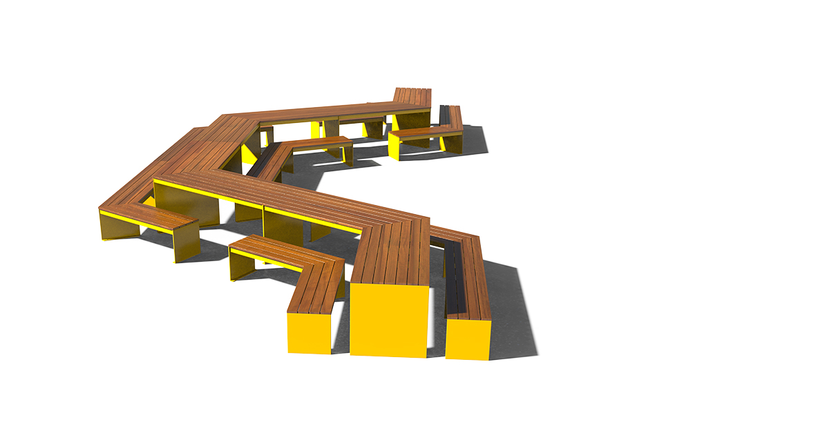 The structure of our modular urban benches is made from painted aluminum. Possible claddings include wood, plastic and natural mineral agglomerate.